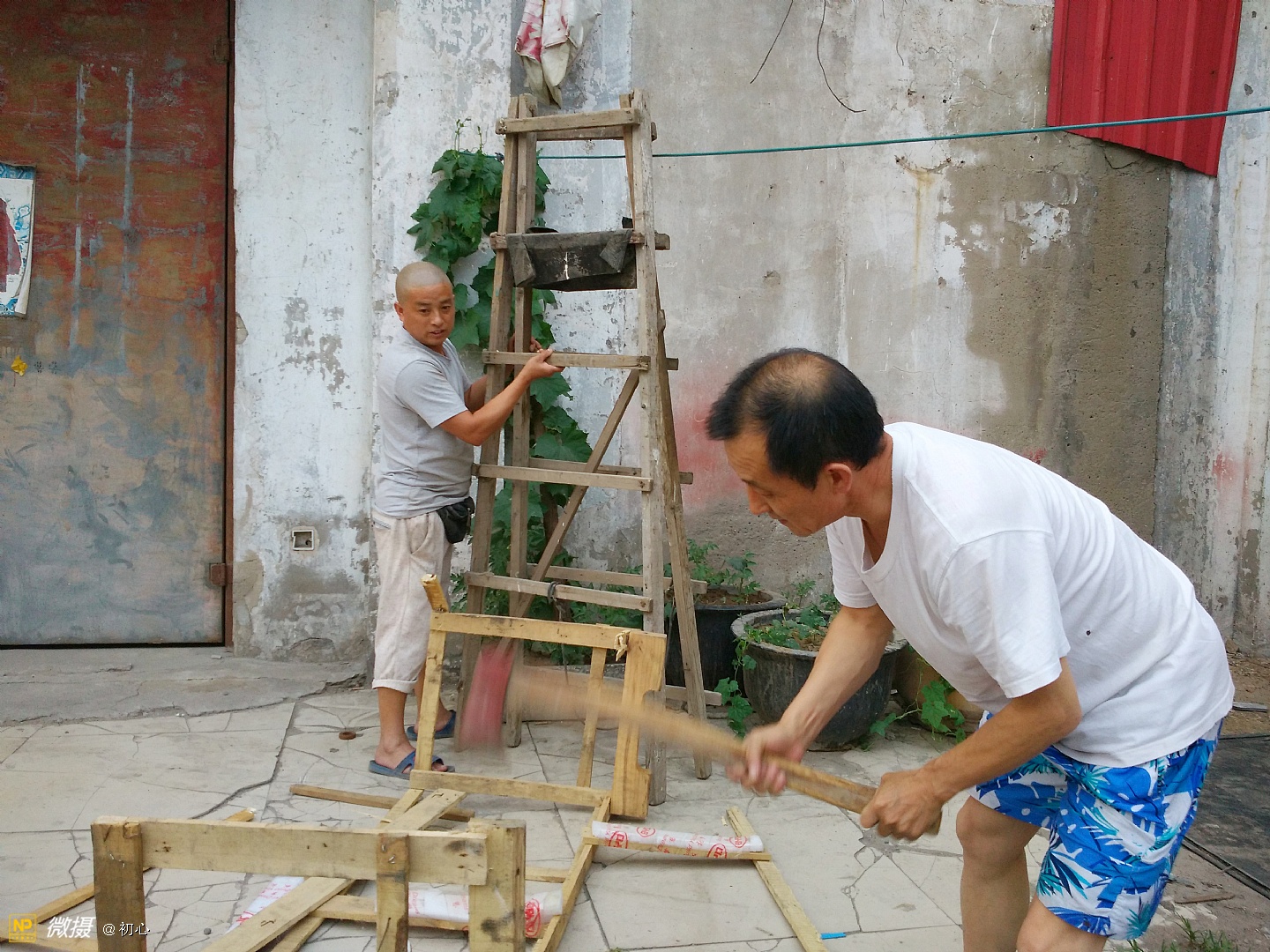 利用废弃的木条制作丝瓜架子。