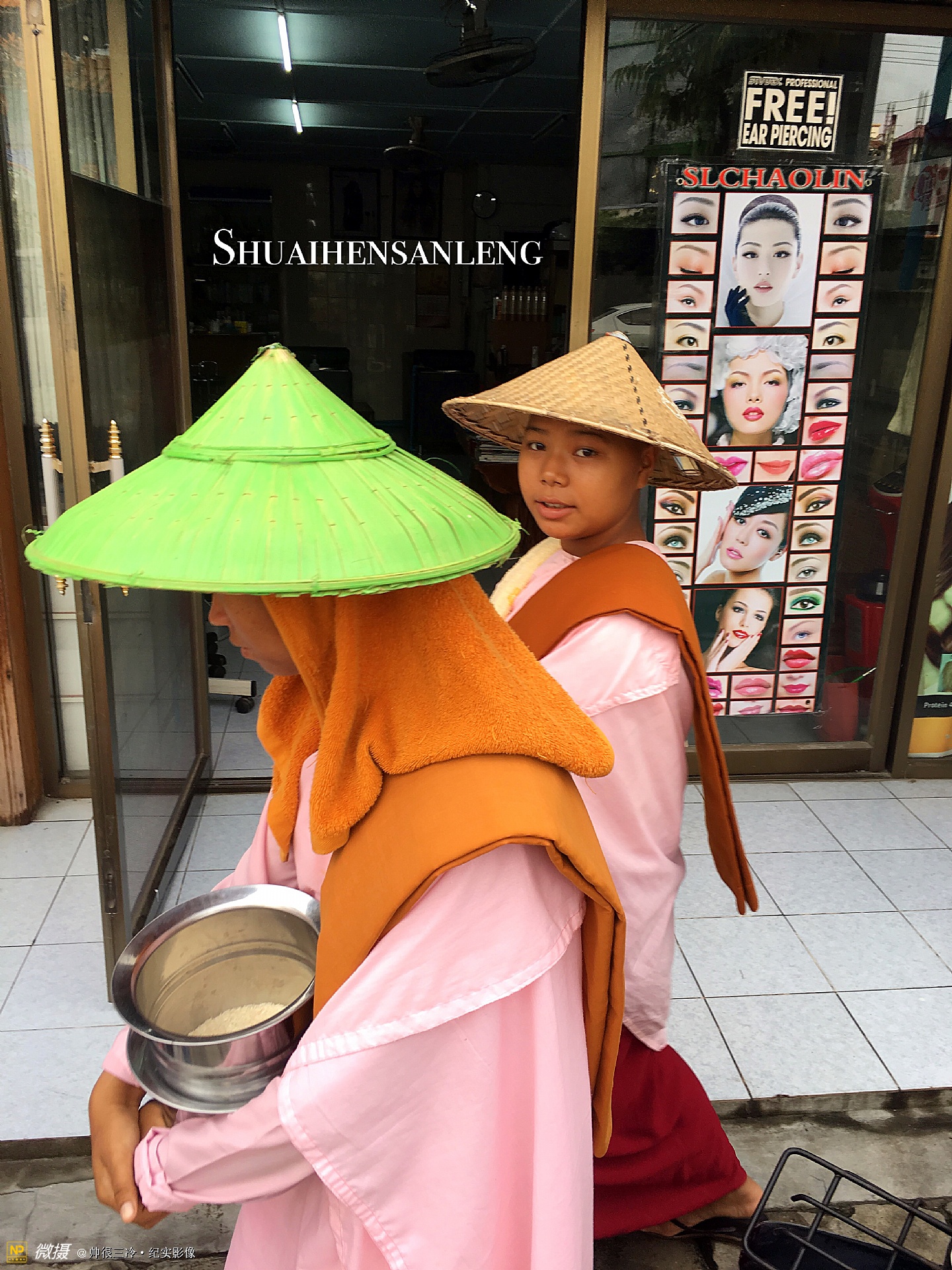 【缅甸】面对现代与传统,映出不同命运的女人,曼德勒街拍影像纪实,三个尼姑正在美蓉厅门口化缘。