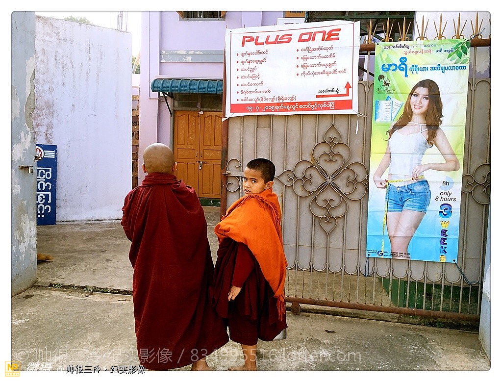 【缅甸】传统与现代,保守与开放。今天上午在缅甸腊戌一户人家门口随拍,当时两个小和尚在门口来化缘,与墙上的广告画有了鲜明对比,缅甸正在开放的道路上⋯